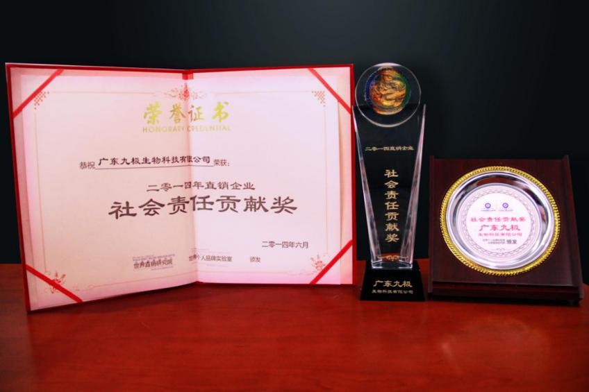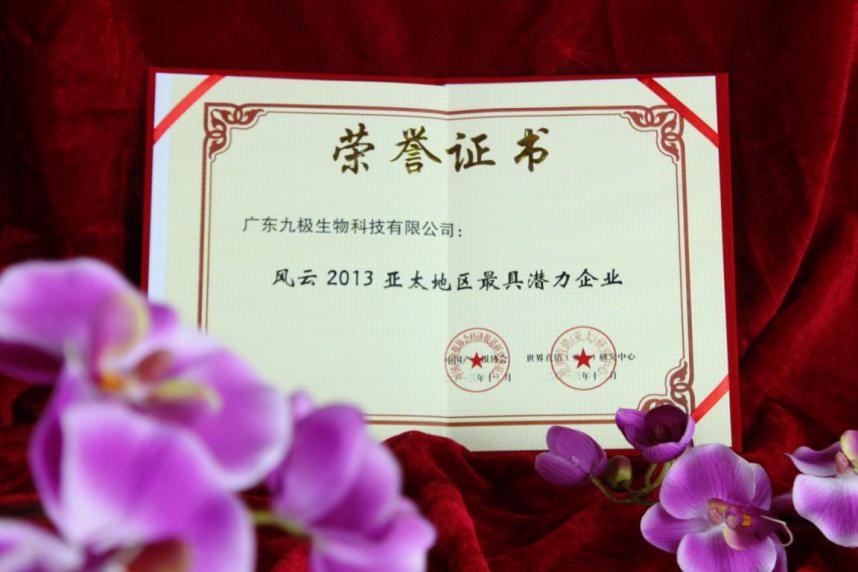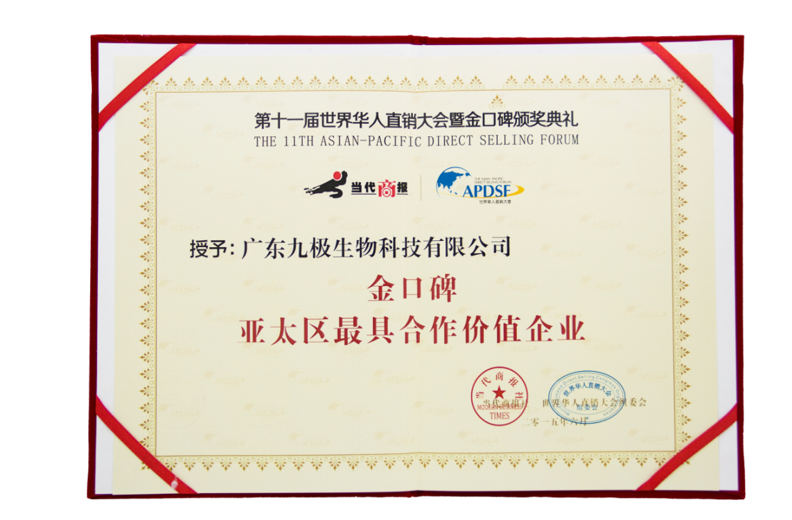 近年來,九極產(chǎn)品獲得了廣大消費者厚愛和好評,獲得風(fēng)云2013亞太地區(qū)最具潛力企業(yè)獎、2014直銷企業(yè)社會責(zé)任貢獻獎、金口碑亞太區(qū)最具合作價值企業(yè)獎等眾多殊榮,也被認定為“廣州市高新技術(shù)企業(yè)”。